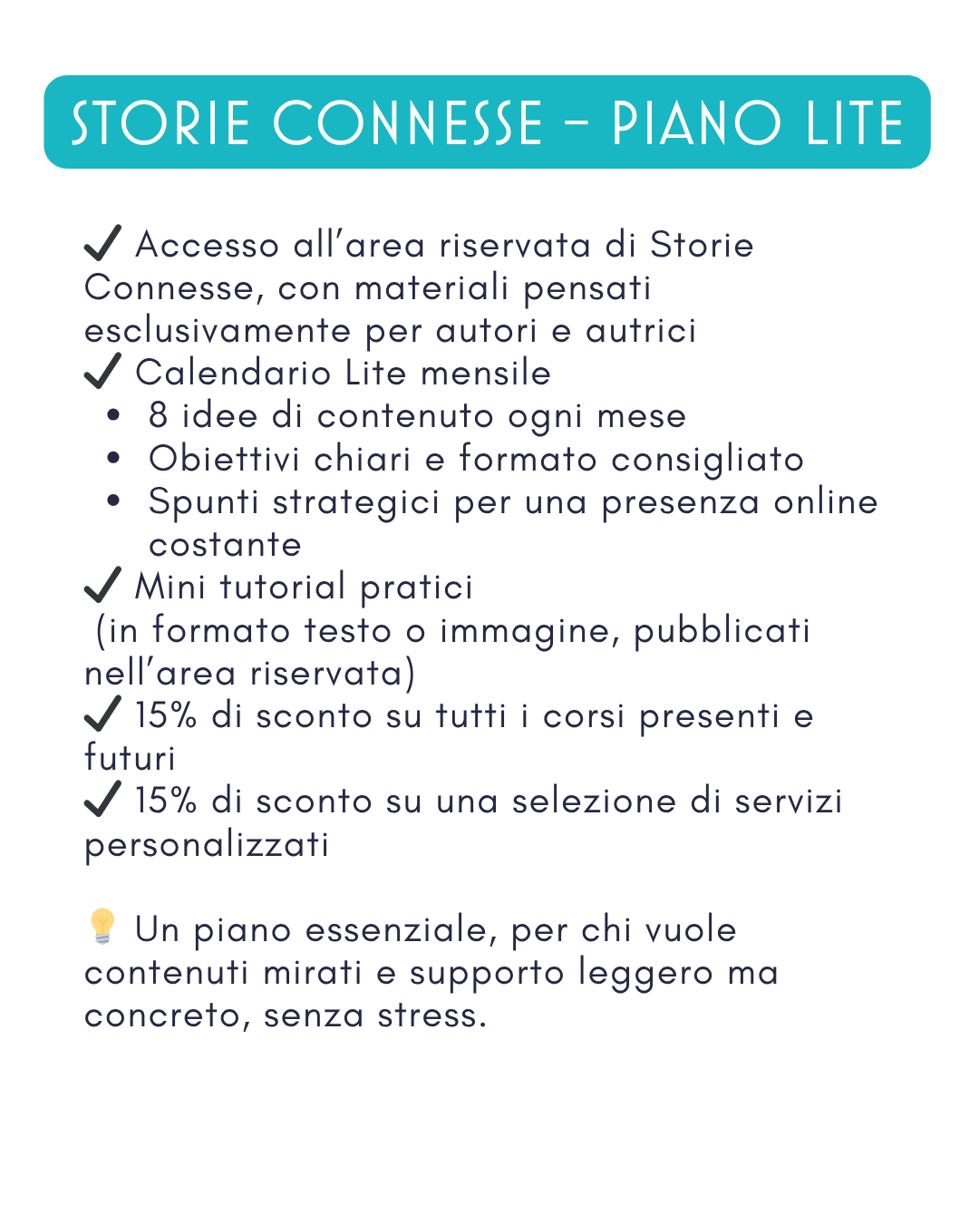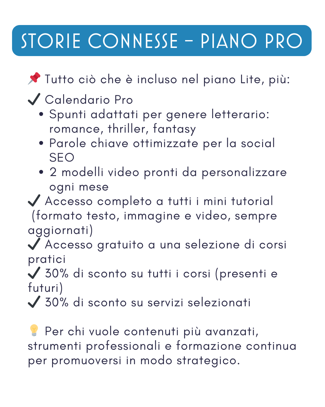 🎯 Storie Connesse non pretende che tu diventi un espert* di social media e bookmarketing. Storie Connesse ti offre una guida costante, flessibile e costruita su ciò che serve davvero a te, che scrivi e pubblichi libri.